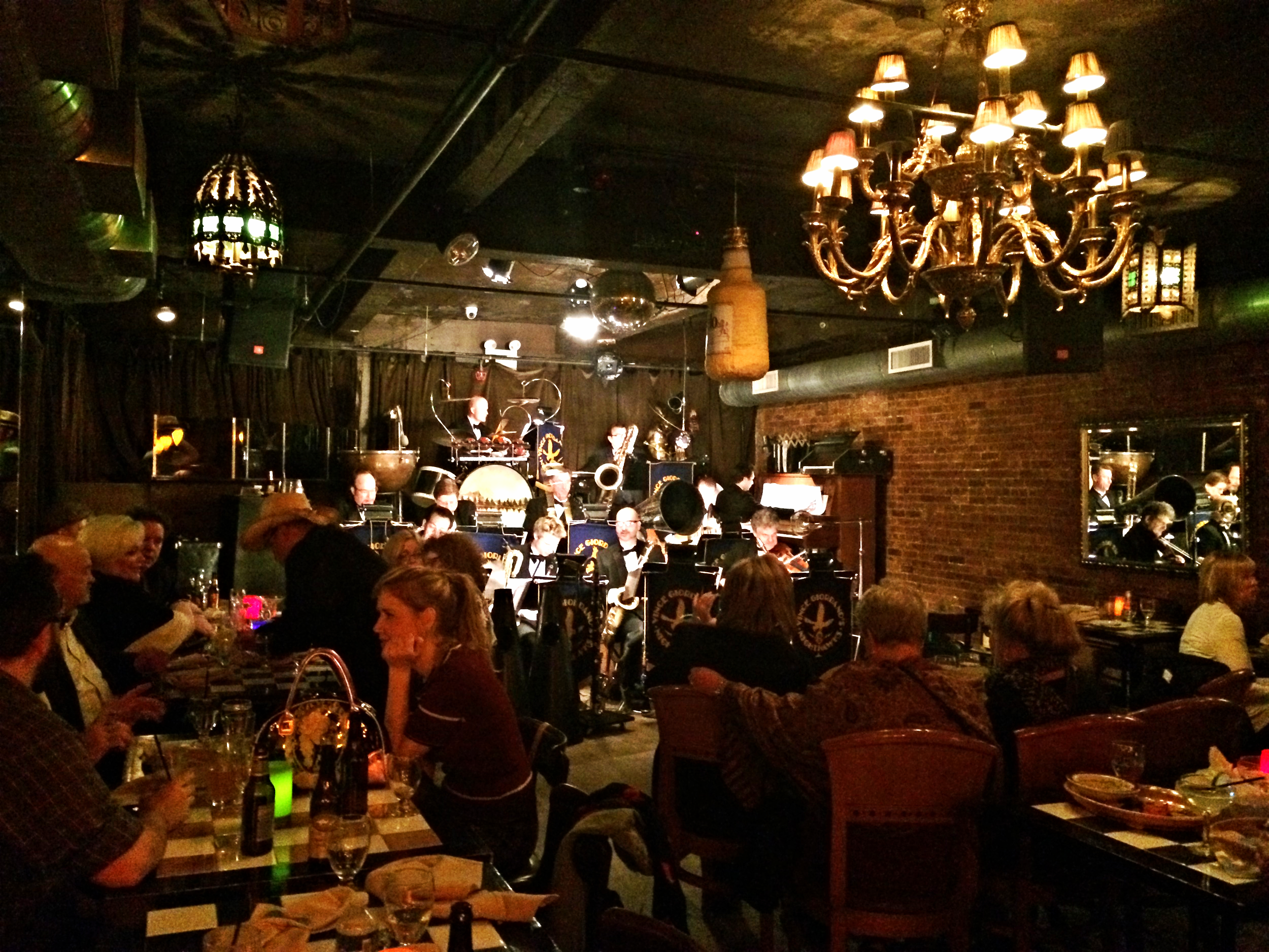 Wanna see some outstanding music on a Monday evening? Head over to Iguana, where on the top floor of this behemoth of a restaurant, Vince Giordano and The Nighthawks play three long sets of big band jazz from the 20's and 30's every Monday and Tuesday night. Giordano briskly leads his band through an expansive repertoire, calling out successive tunes as the players each retrieve one of several binders, frantically flipping through the pages within to the right song.